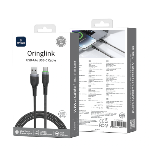 The WiWU Wi-C067 is a USB-A to USB-C data cable designed for high-speed 9V-3A charging. Featuring premium aluminum alloy shells and tough nylon braided exterior, it provides both durability and style. Ideal for charging and syncing USB-C devices like smartphones, tablets, and game consoles. A reliable 1-meter cable built to Q/RMM018-2017 standards.